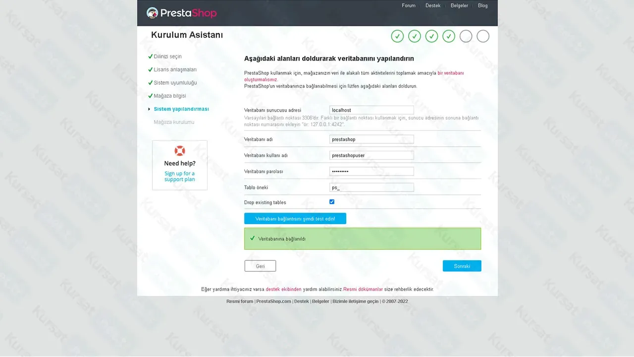Hosting kontrol panelinizden oluşturduğunuz veritabanı adı, veritabanı kullanıcı adı ve şifresini girerek bağlantı sağlanabilirliğini test edin. Veritabanı sunucusu hosting firmalarında genel olarak standarttır, “localhost” olarak giriş yapabilirsiniz.